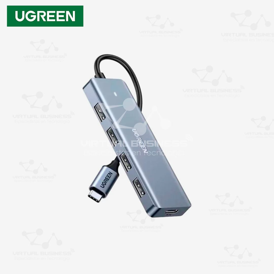 Adaptador UGREEN HUB USB 3.0 CM219-70336 con 4 puertos de alta velocidad, fuente de alimentación USB-C y diseño compacto.