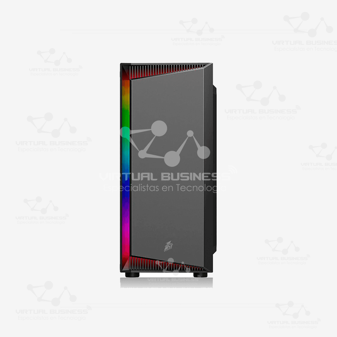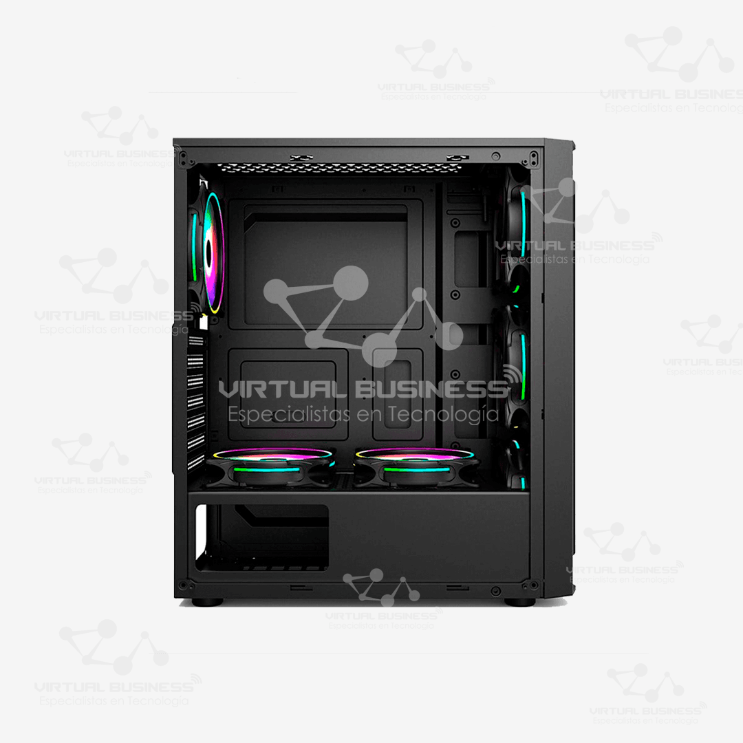 El RB-4 Black incluye un panel lateral de vidrio templado, lo que permite una vista clara de los componentes internos y la iluminación RGB, añadiendo un toque visual destacado a tu setup. Su estilo moderno en color negro, combinado con detalles minimalistas, lo convierte en una opción atractiva para cualquier entorno, ya sea un espacio de trabajo o un setup gaming profesional.