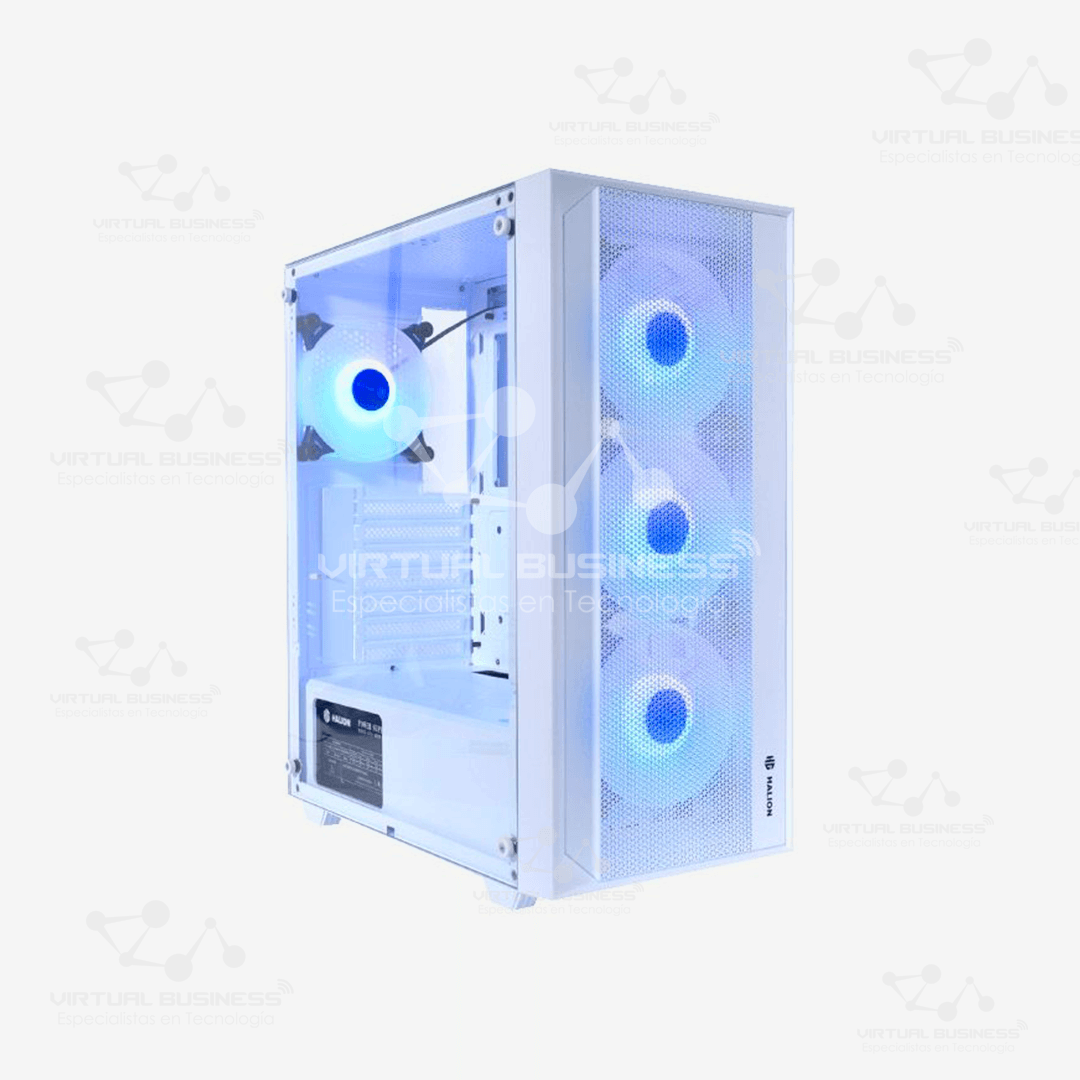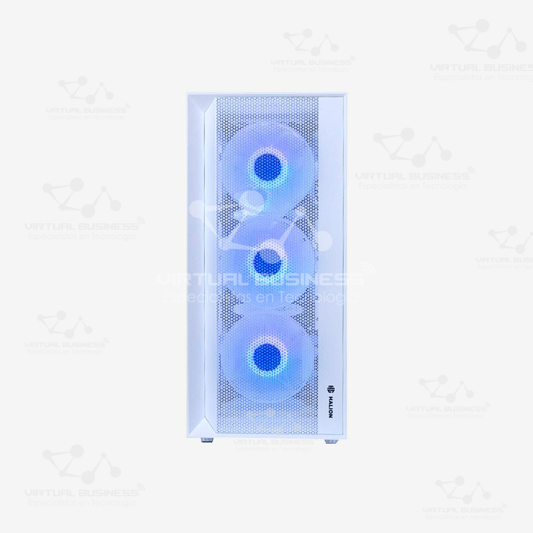 El HALION TORNADO 04WH presenta un diseño elegante en color blanco, con paneles frontal y lateral de vidrio templado que permiten una visualización completa de los componentes internos. Incluye tres ventiladores frontales y uno posterior de 120mm con iluminación ARGB, que añaden un toque estético y mejoran la ventilación del sistema.