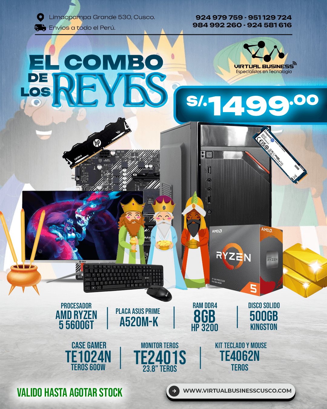 Celebra el Día de los Reyes Magos con este espectacular combo tecnológico. Incluye componentes de alta calidad y un diseño perfecto para quienes buscan rendimiento y potencia en sus equipos. Por solo S/1499.00, este combo es ideal para gamers, estudiantes y profesionales.