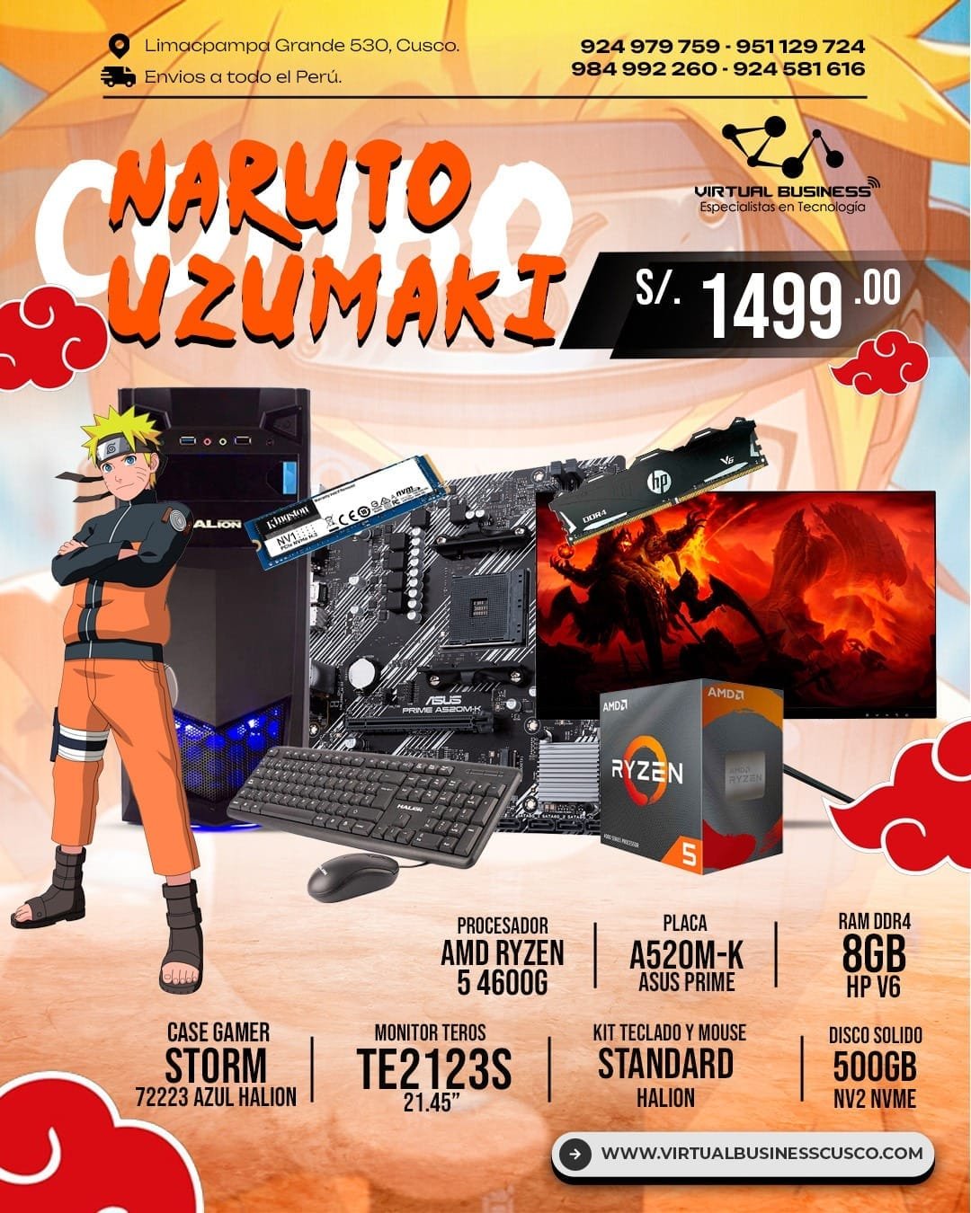 El Combo Naruto Uzumaki combina potencia y diseño, ideal para quienes buscan un equipo confiable para gaming y productividad. Su configuración asegura un excelente desempeño en juegos y tareas del día a día.