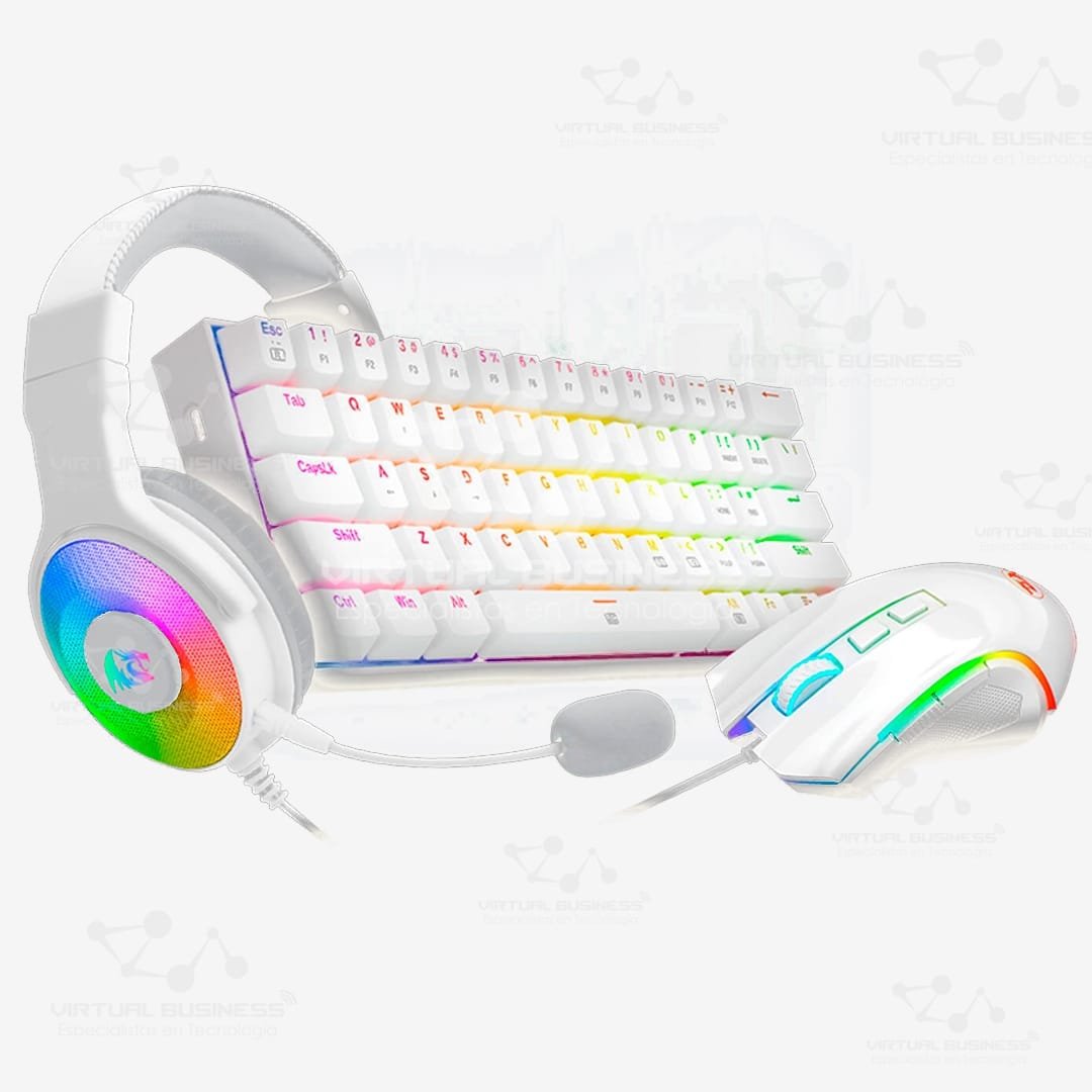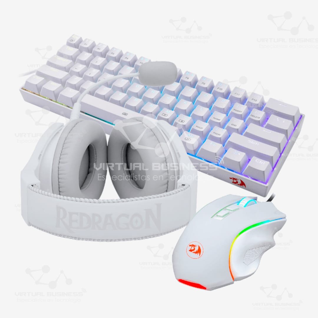 El COMBO GAMER REDRAGON S129W es un conjunto de periféricos gaming diseñado para jugadores que buscan estilo, funcionalidad y rendimiento. Este combo incluye un teclado mecánico compacto, un ratón RGB de alta precisión y unos auriculares con sonido envolvente 7.1, todos en un atractivo color blanco.