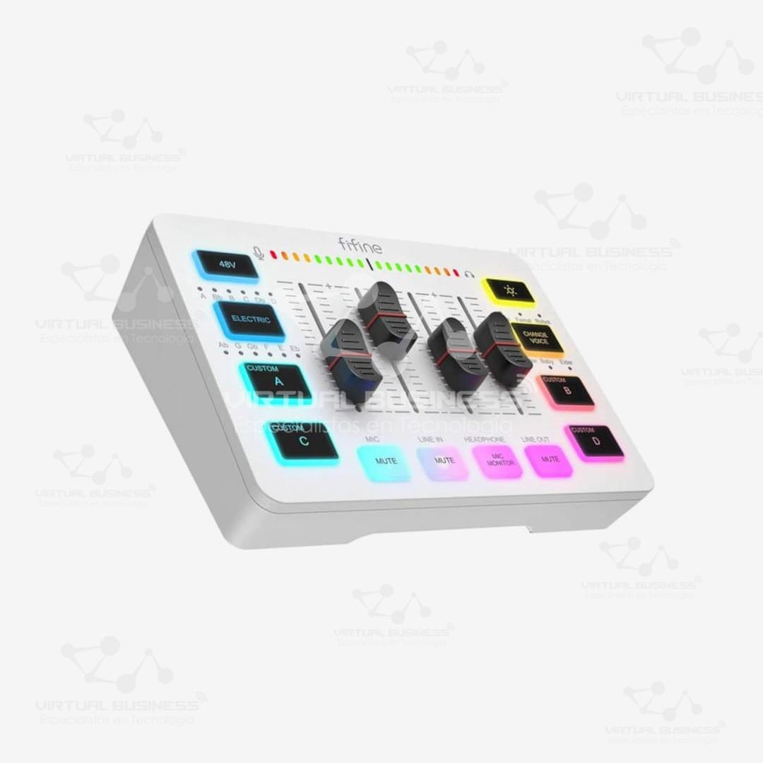 Toma el control absoluto de tu audio y lleva tu stream al siguiente nivel con el Mixer Fifine SC3. Esta compacta y potente mezcladora de audio está diseñada para streamers y creadores de contenido que quieren manejar todo su sonido de forma fácil y profesional. Por lo tanto, si buscas una forma de balancear el volumen de tu voz, el juego y la música en tiempo real, este es tu centro de comando. Su increíble diseño en color blanco y su iluminación RGB le darán un look espectacular a tu setup.