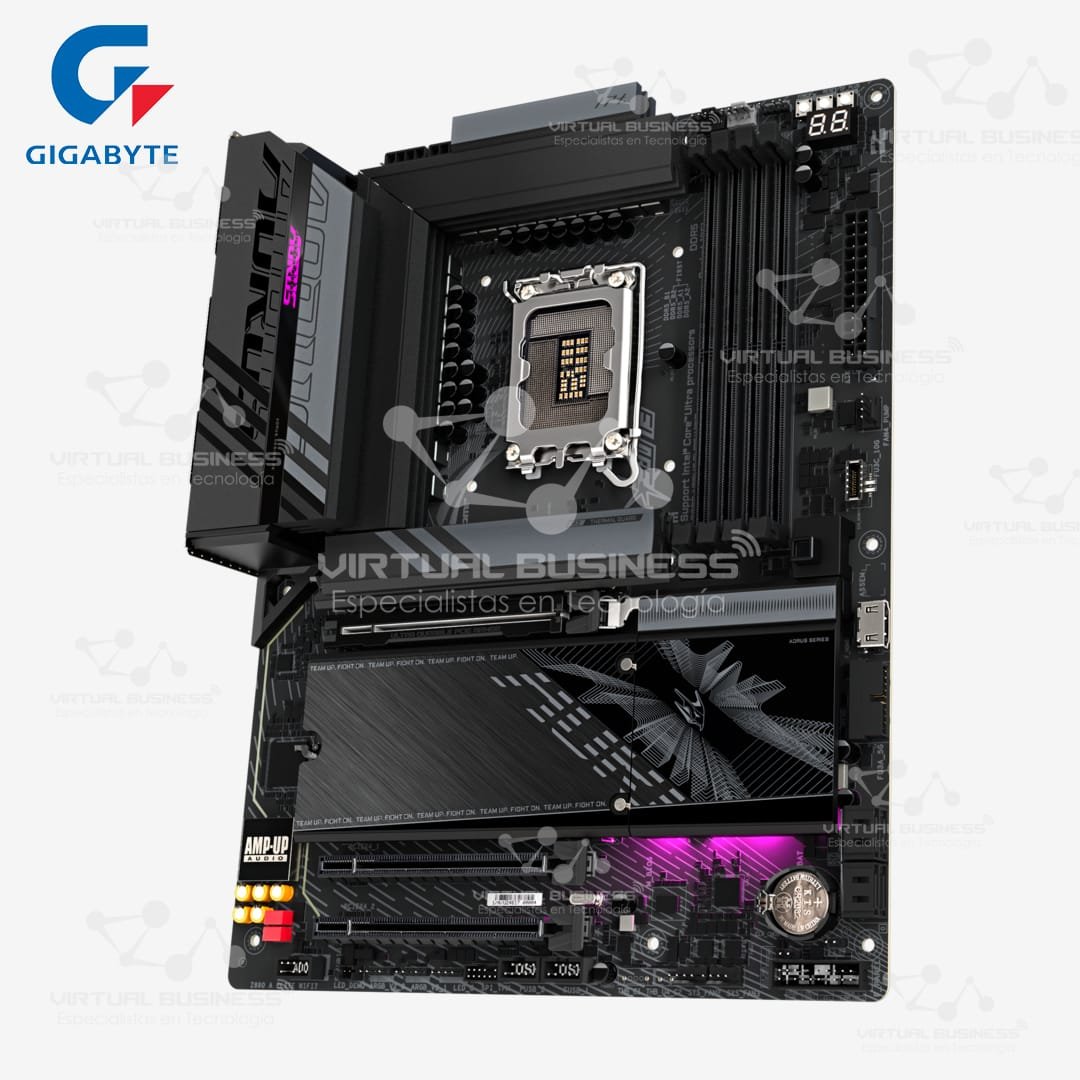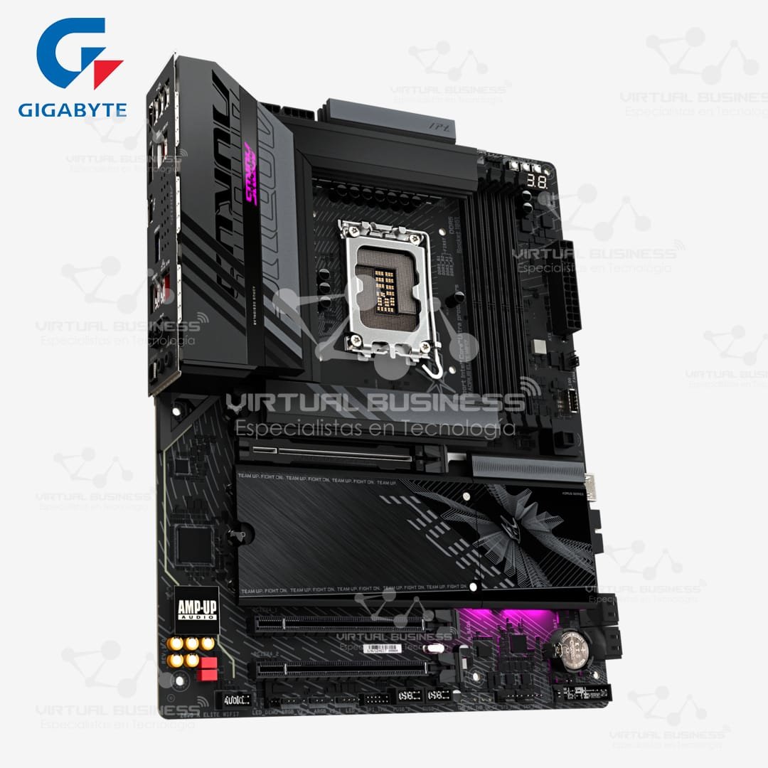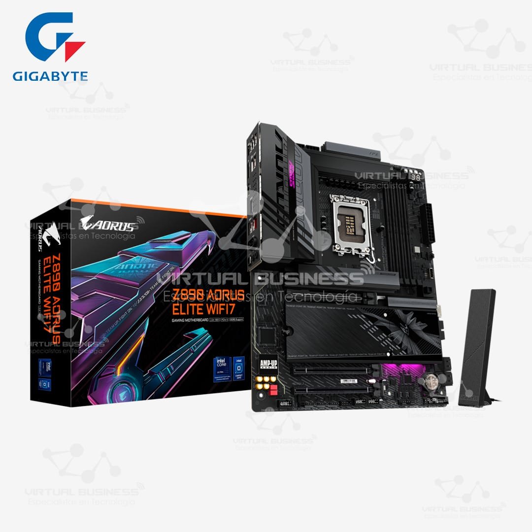Forja tu nueva PC de élite con la imponente Gigabyte AORUS Z890 ELITE WIFI7. Esta placa madre de formato ATX es la base definitiva para los gamers y entusiastas que buscan un rendimiento extremo y las tecnologías del mañana. Por lo tanto, si planeas construir un sistema con los nuevos procesadores Intel de 15ª generación y llevar el overclocking al límite, esta es tu mejor arma. Es el poder y la calidad que definen a la marca AORUS.