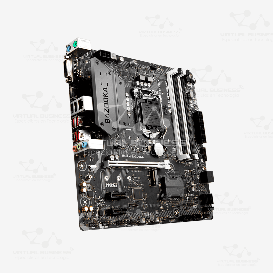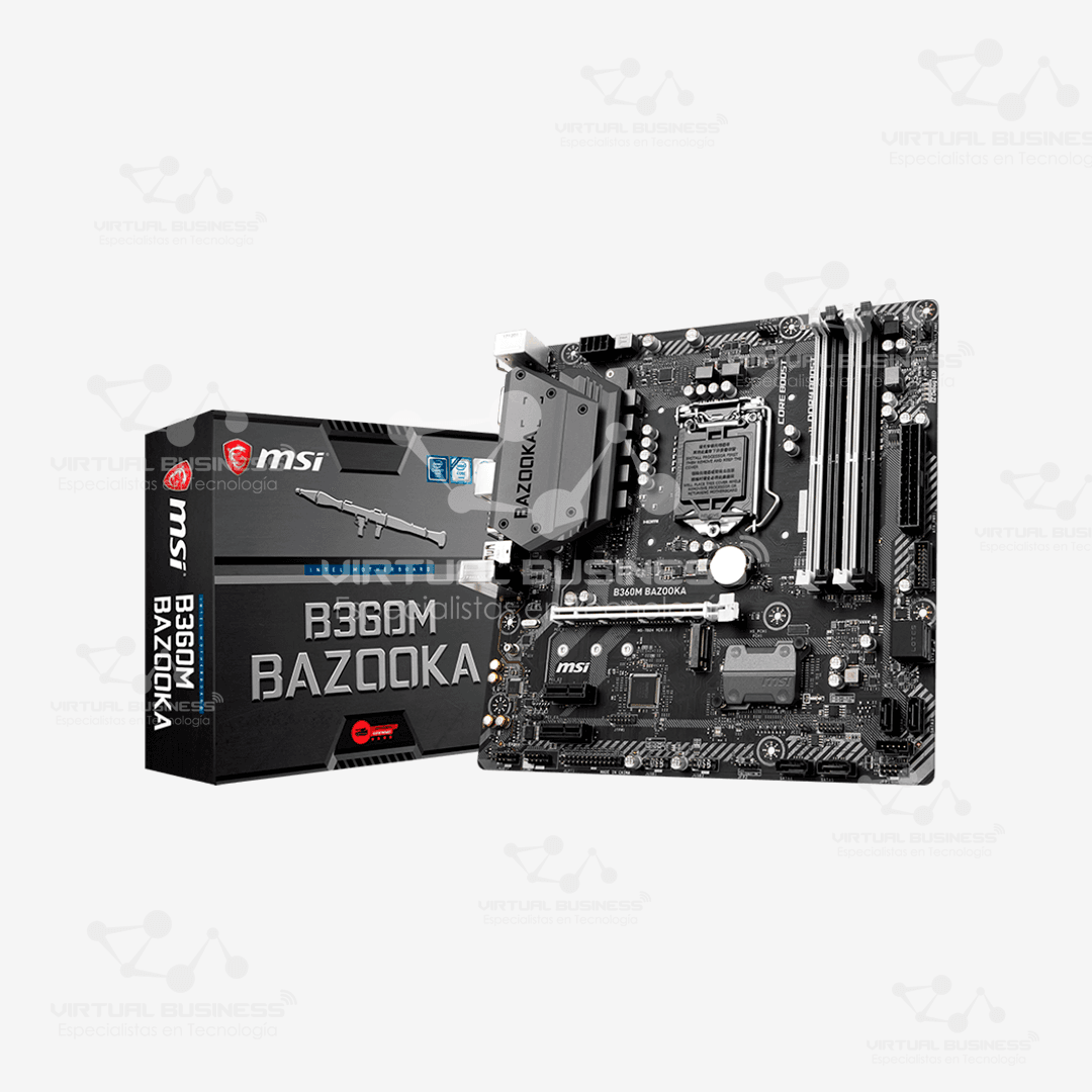 La MSI B360M BAZOOKA es una placa base Micro-ATX diseñada para ofrecer un rendimiento sólido y confiable. Es compatible con procesadores Intel de 8ª y 9ª generación, lo que la convierte en una opción ideal para gaming, creación de contenido y tareas multitarea. Además, su diseño robusto asegura un funcionamiento estable, tanto para jugadores como para profesionales que necesitan un sistema duradero.