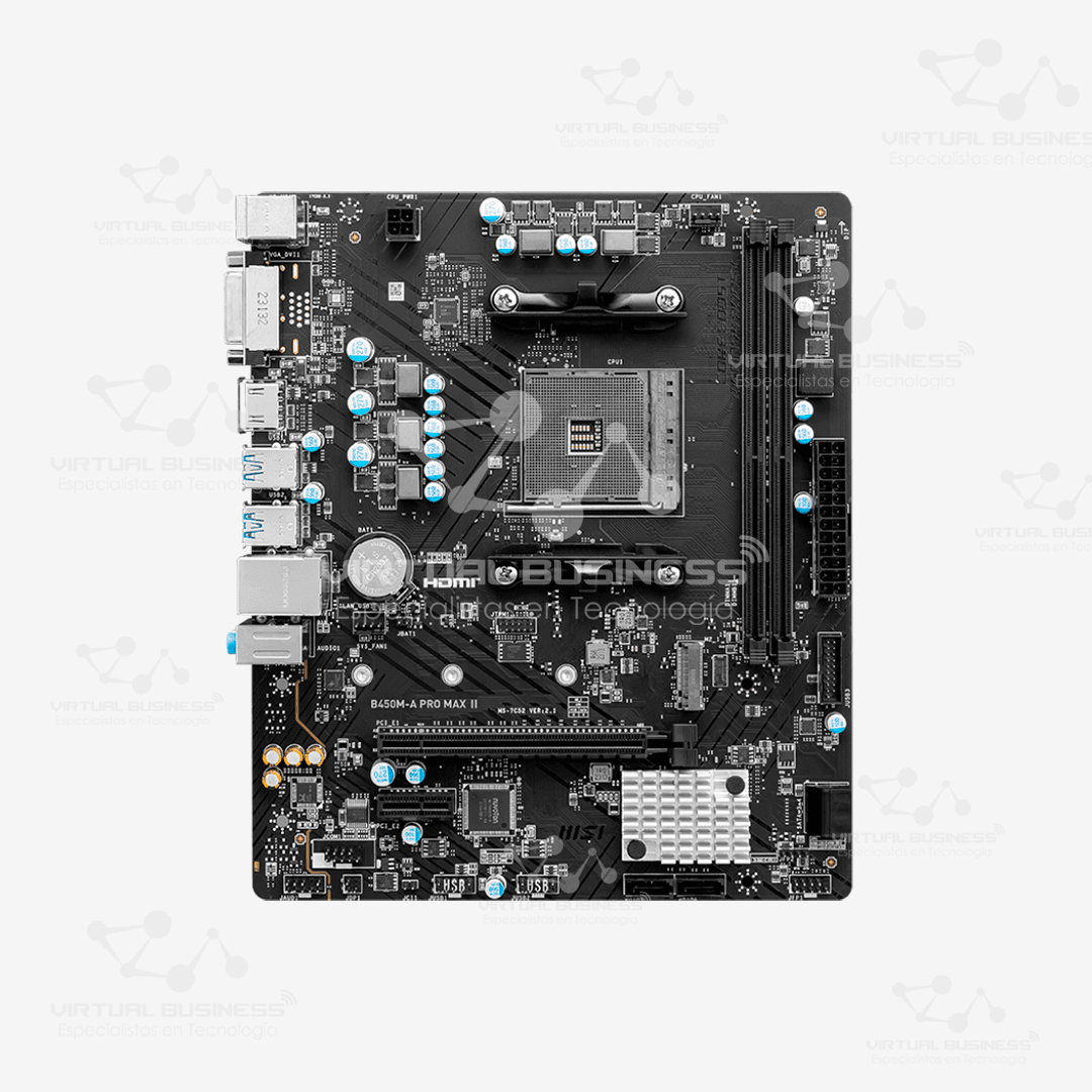 La MSI B450M-A PRO MAX II es una placa base Micro-ATX diseñada para ofrecer un excelente rendimiento en sistemas compactos. Compatible con procesadores AMD Ryzen de 1ª, 2ª y 3ª generación, es ideal para quienes buscan construir un equipo versátil, ya sea para gaming moderado, trabajos de oficina o tareas de creación de contenido. Su relación calidad-precio la convierte en una opción atractiva para usuarios que desean rendimiento sin gastar de más.