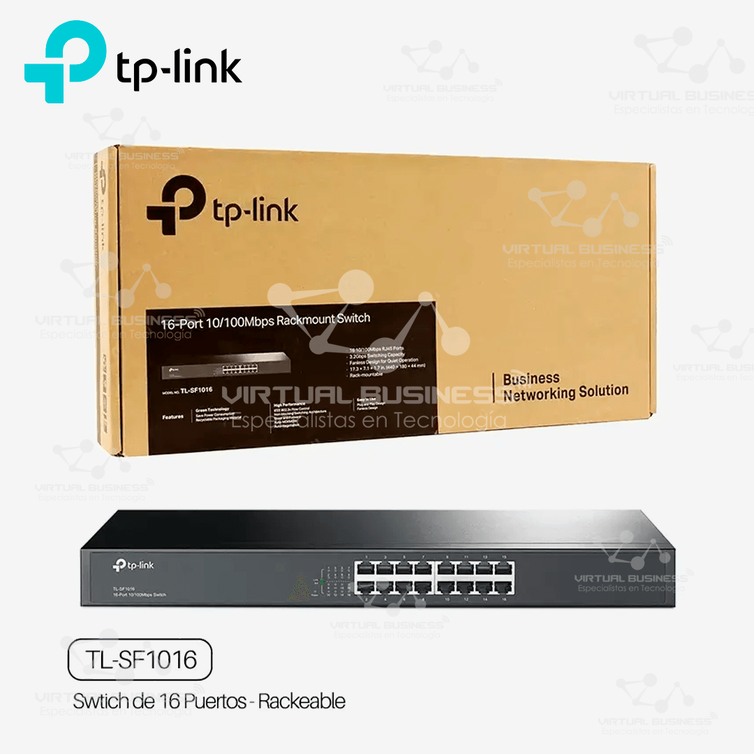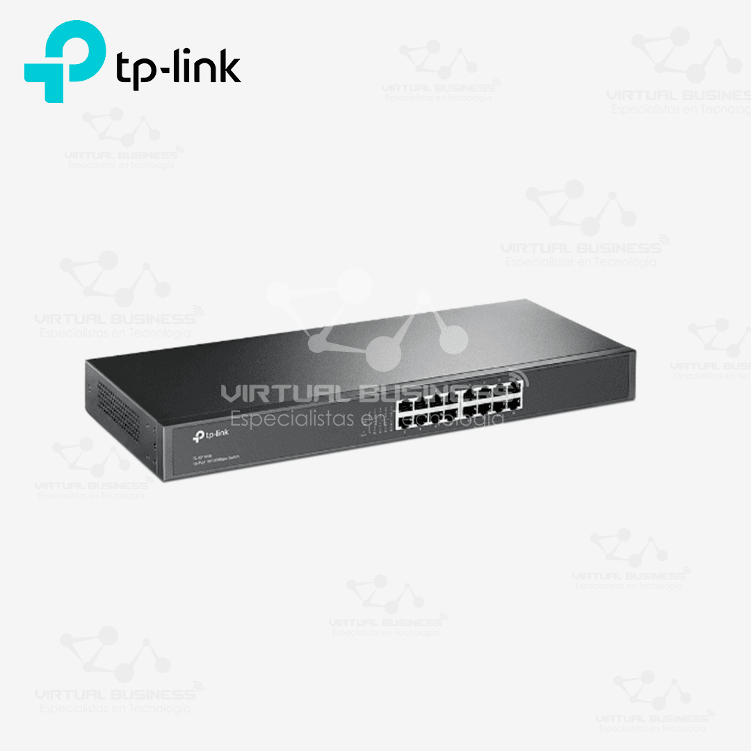 El TP-Link TL-SF1016 es un switch de escritorio o montaje en rack con 16 puertos RJ45 de 10/100 Mbps. Es ideal para ampliar una red local en oficinas, negocios o espacios educativos. Cada puerto es auto MDI/MDIX, lo que elimina la necesidad de cables cruzados.