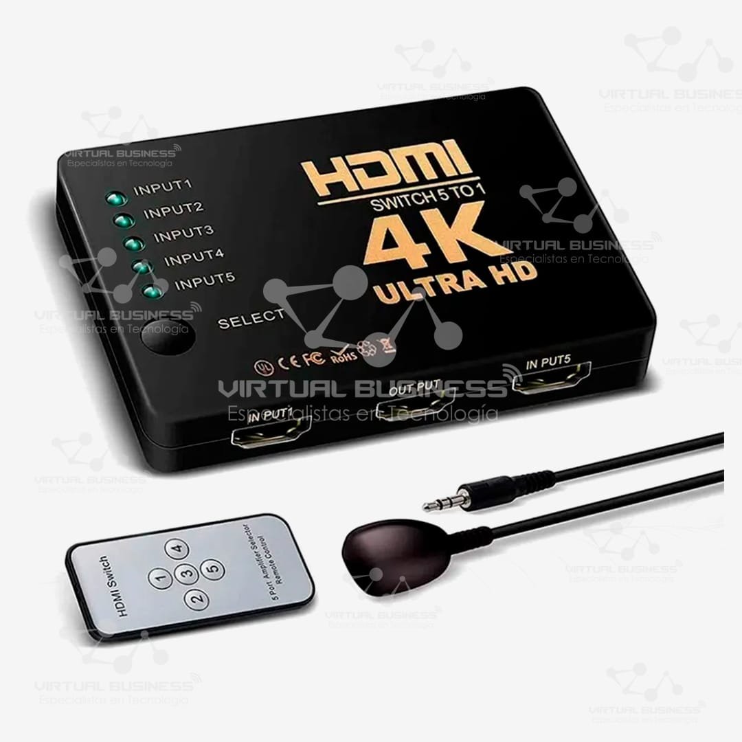 El Switcher HDMI 5 en 1 con Soporte a 4K es la solución ideal para quienes necesitan conectar varios dispositivos HDMI a un solo puerto de entrada en su **pantalla oppantalla o proyector . Este dispositivo permite conmutar entre 5 dispositivos HDMI de forma rápida y sencilla, todo con soporte para resolución 4K , lo que garantiza una experiencia visual de alta definición sin pérdida de calidad.